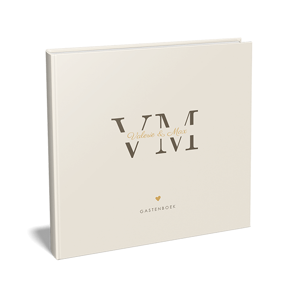 Ontwerp een beige gastenboek bruiloft zodat gasten hun naam achter kunnen laten. Dit is een vierkant gastenboek in klassieke stijl met initialen en een hartje.| Totaalprijs: 0 |