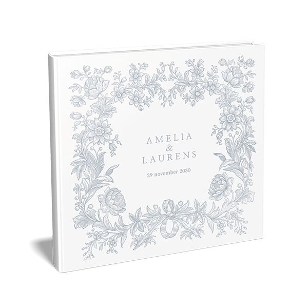 Bestel een gastenboek bruiloft zodat gasten hun naam en een lieve wens kunnen achterlaten. Dit is een vierkant gastenboek in klassieke stijl met een bloemenkrans.| Totaalprijs: 0 |