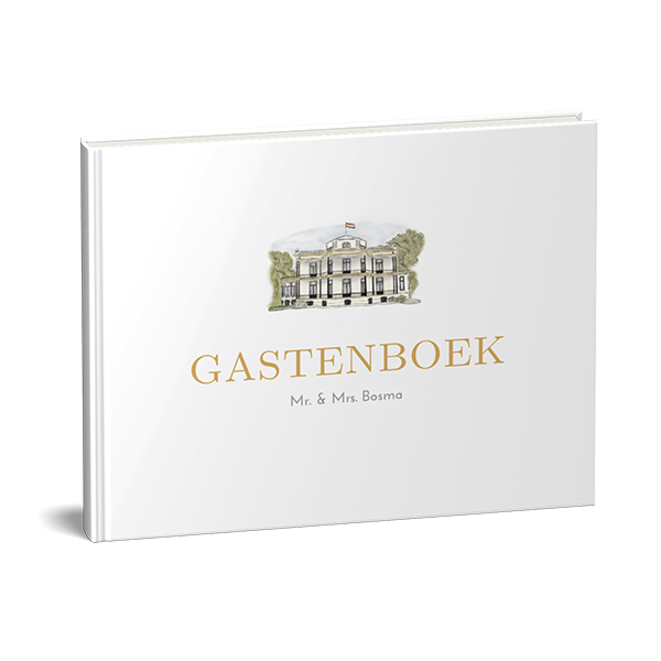 Laat gasten hun naam of een lieve boodschap schrijven in een gastenboek. Dit is een liggend klassiek gastenboek met de trouwlocatie.