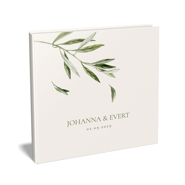Ontwerp een vierkant gastenboek voor de bruiloft met olijftakjes. In dit gastenboek laat je gasten van de bruiloft hun naam schrijver. Zo heb je een mooi aandenken aan jullie dag.