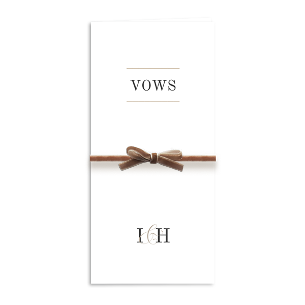 Een gelofteboekje is een dubbele kaart waar je geloftes in kan schrijven. Dit is een gelofteboekje met een logo van jullie initialen. Om het boekje vouw je een taupe velvet lintje. Dit lint bestel je los bij het boekje.