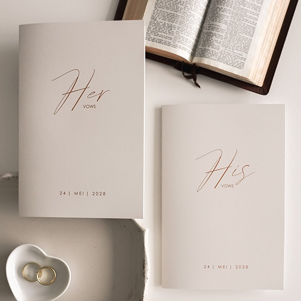 Maak van een grote kaart een gelofteboekje waar je de geloftes in kan schrijven of direct laten afdrukken. Dit is een stijlvol gelofteboekje, op de voorkant wordt goudfolie gedrukt. Het boekje past bij een trouwkaart in dezelfde stijl.