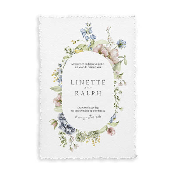 Bestel een DIY-trouwkaart in handgeschepte papierstijl. Dit is een romantische trouwkaart met een bloemenkrans. Om de uitstraling van handgeschept papier te creëren, scheur je de trouwkaart zelf langs de stippellijntjes. Hier heb je