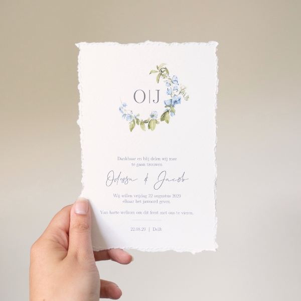 Bestel een DIY-trouwkaart met blauwe bloemen in handgeschepte papierstijl. Om de uitstraling van handgeschept papier te creëren, scheur je de trouwkaart zelf langs de stippellijntjes. Hier heb je