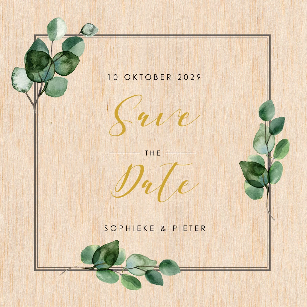 Een botanische houten Save the Date kaart om zelf te maken. De combinatie van eucalyptus blaadjes met het echte berkenhout maakt deze Save the Date kaart uniek. Je kunt in de kaartopmaker alle teksten aanpassen. We hebben in de beeldbank ook een map met meer EUCALYPTUS blaadjes.