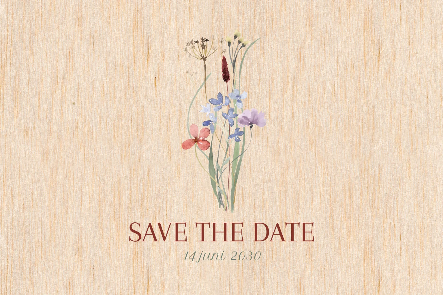 Ontwerp een originele Save the Date met bloemen op hout. Deze Save the Date wordt gedrukt op echt hout. Bestel altijd een proefdruk om het resultaat op hout in het echt te zien.
