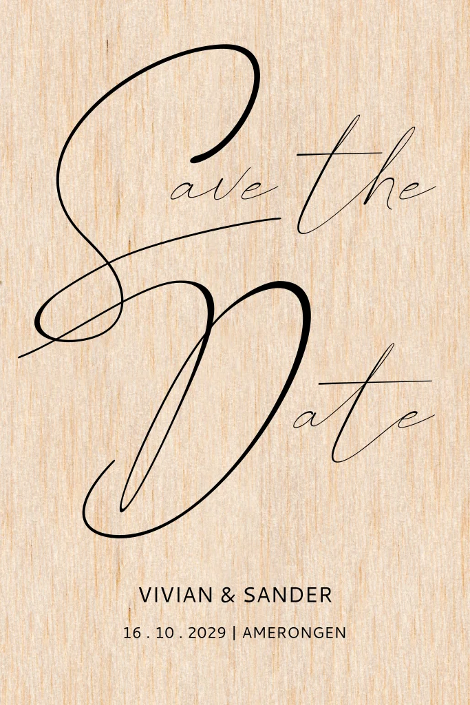 Een houten Save the Date kaart waar je zelf een stijlvol ontwerp van kunt maken. Je past de teksten eenvoudig aan in de kaartopmaker. Deze Save the Date wordt op écht berkenhout gedrukt.