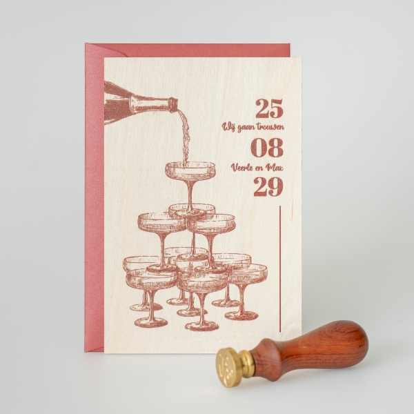 Ontwerp een houten trouwkaart met champagnetoren. Dit is een trend trouwkaart met een champagne toren en jullie trouwdatum in warm rode tint; de trendkleur voor dit trouwseizoen.