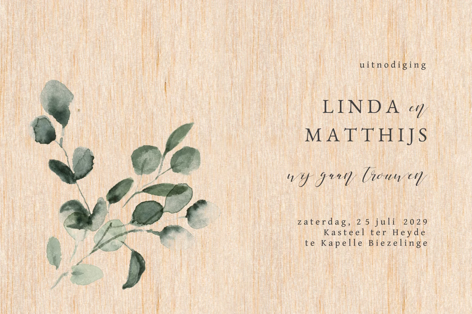 Maak je eigen houten trouwkaart met een mooi eucaluptus takje. Je kunt de teksten in de kaartopmaker aanpassen. Mooi met een donker groene envelop. Bijpassend extra kaartje nodig? Neem contact met ons op.