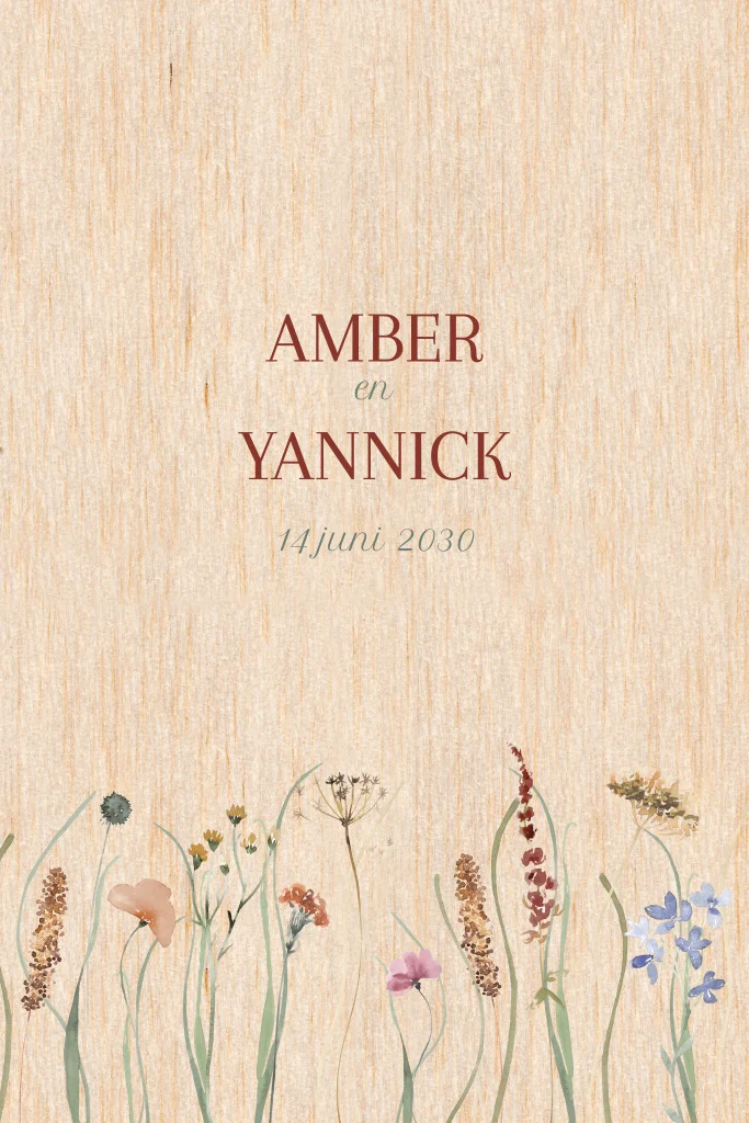 Maak een houten trouwkaart met illustraties van zomerse bloemen. Liever andere bloemetjes? In de editor pas je eenvoudig de illustraties en teksten aan. Door je ontwerp op hout te laten drukken, zorg je voor een originele en persoonlijke trouwuitnodiging.