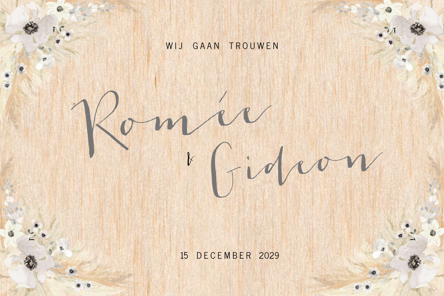 Uitnodiging bruiloft van hout met beige bloemetjes