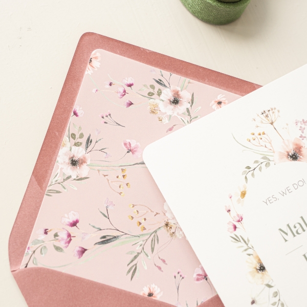 Bestel een inlay voor in de envelop bij de trouwkaart. Dit is een roze inlay met bloemen, passend bij de trouwuitnodiging.