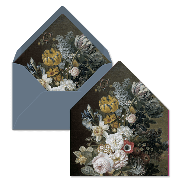 Maak een unieke envelop voor jullie trouwkaart. Je plakt deze trend inlay zelf in de envelop. Dit is een inlay envelop met stilleven van bloemen.