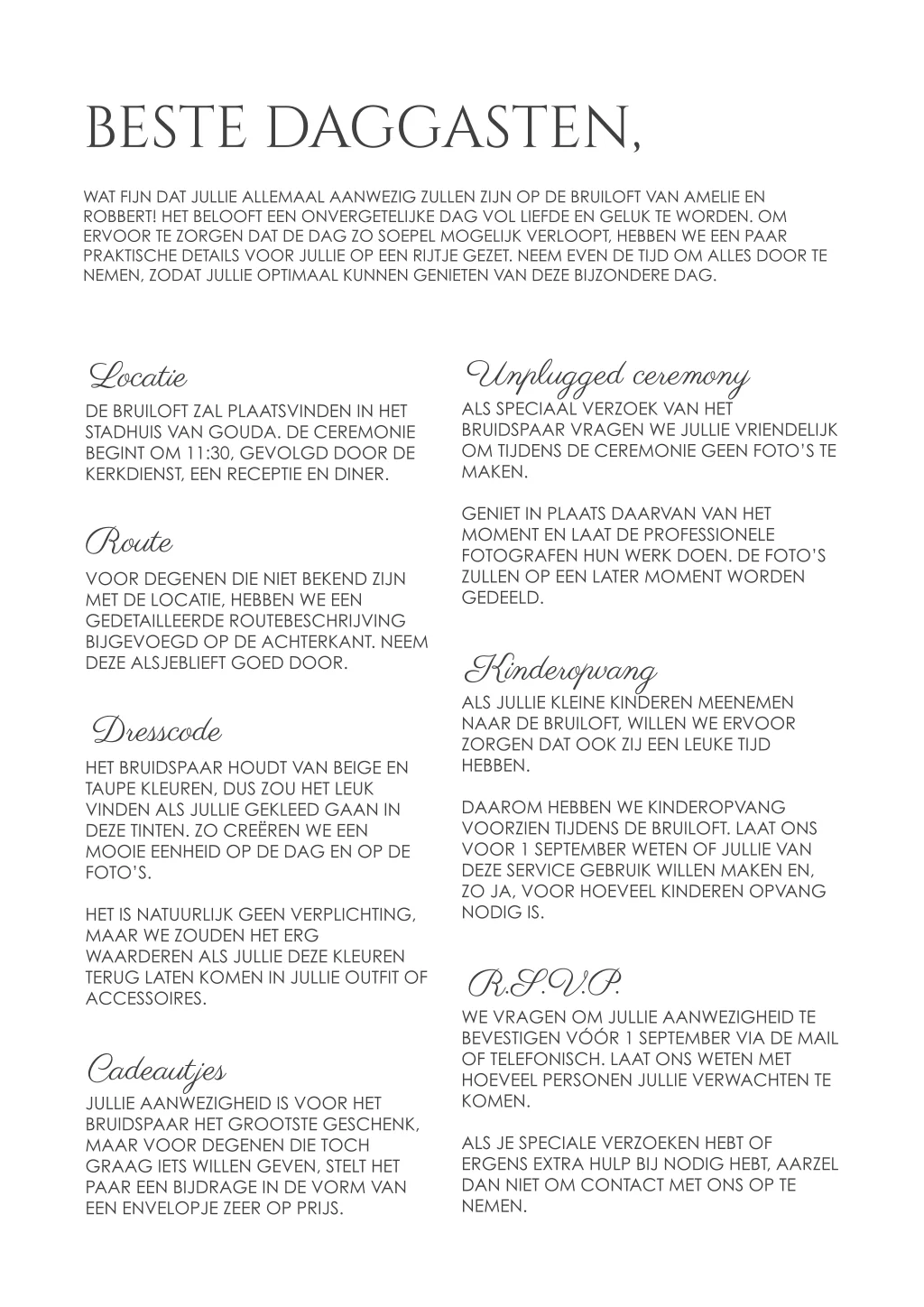 Ontwerp een inlegvel in A4 formaat voor extra informatie bij de trouwkaart. Denk aan informatie over de locatie, een routebeschrijving, cadeautips over een verrassing. Dankzij dit formaat heb je genoeg ruimte om alle informatie over de dag te noteren. Je kan ook de achterkant gebruiken.| Totaalprijs: 0 |