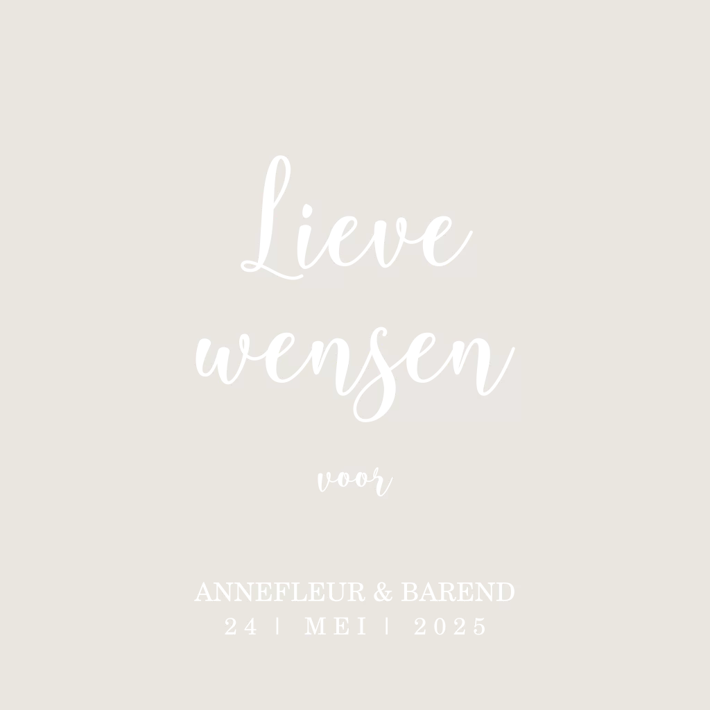 Maak invulkaartjes voor de bruiloft die passen bij het ontwerp van de trouwkaart. Op de achterkant kun je het logo weer terug laten komen. Zo creëer je eenheid. Op de voorkant wordt folie gedrukt. Op de achterkant kunnen gasten naam en wens invullen.| Totaalprijs: 0 |