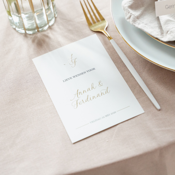 Een invulkaartje met goudfolie. De kleur folie op de kaart kan ook verandert worden naar een andere kleur folie.