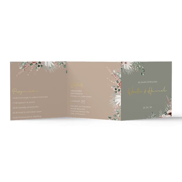 Laat met een jubileumkaart weten dat jullie een mijlpaal in jullie huwelijk vieren, en nodig geliefden uit om dit speciale moment samen te beleven. Dit is een drieluik jubileumkaart met bloemen en goudfolie.