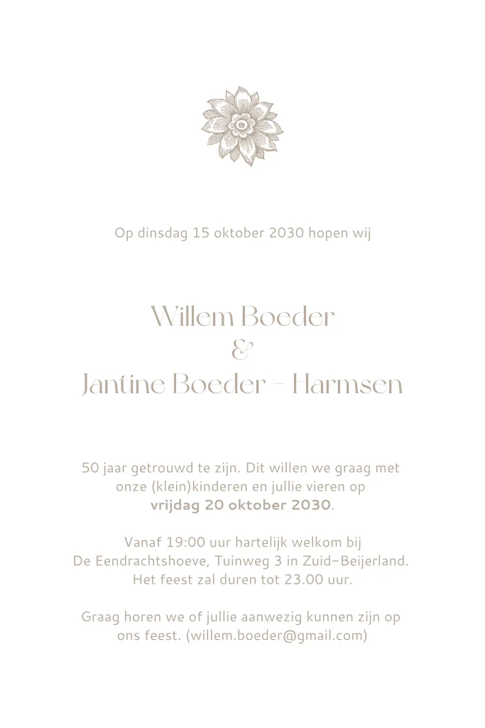 Zijn jullie binnenkort 50 jaar getrouwd? Bestel dan een chique kaart 50 jaar getrouwd om jullie huwelijksjubileum bekend te maken bij familie en vrienden. Dit is een klassieke jubileumkaart met een bloemenkrans en goudfolie, wat zorgt voor een glimmend laagje op de kaart.