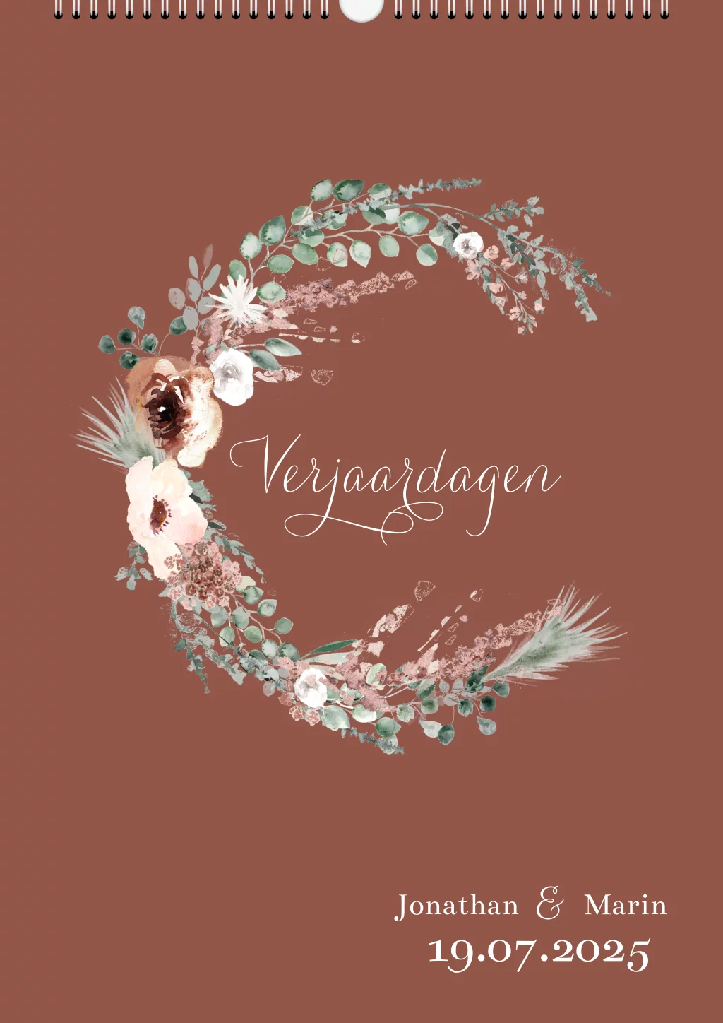 Gebruik een kalender als origineel alternatief voor een gastenboek. Laat bruiloftsgasten hun verjaardag noteren in deze kalender. Dit is een kalender met boho bloemen en past bij een trouwkaart in dezelfde stijl.