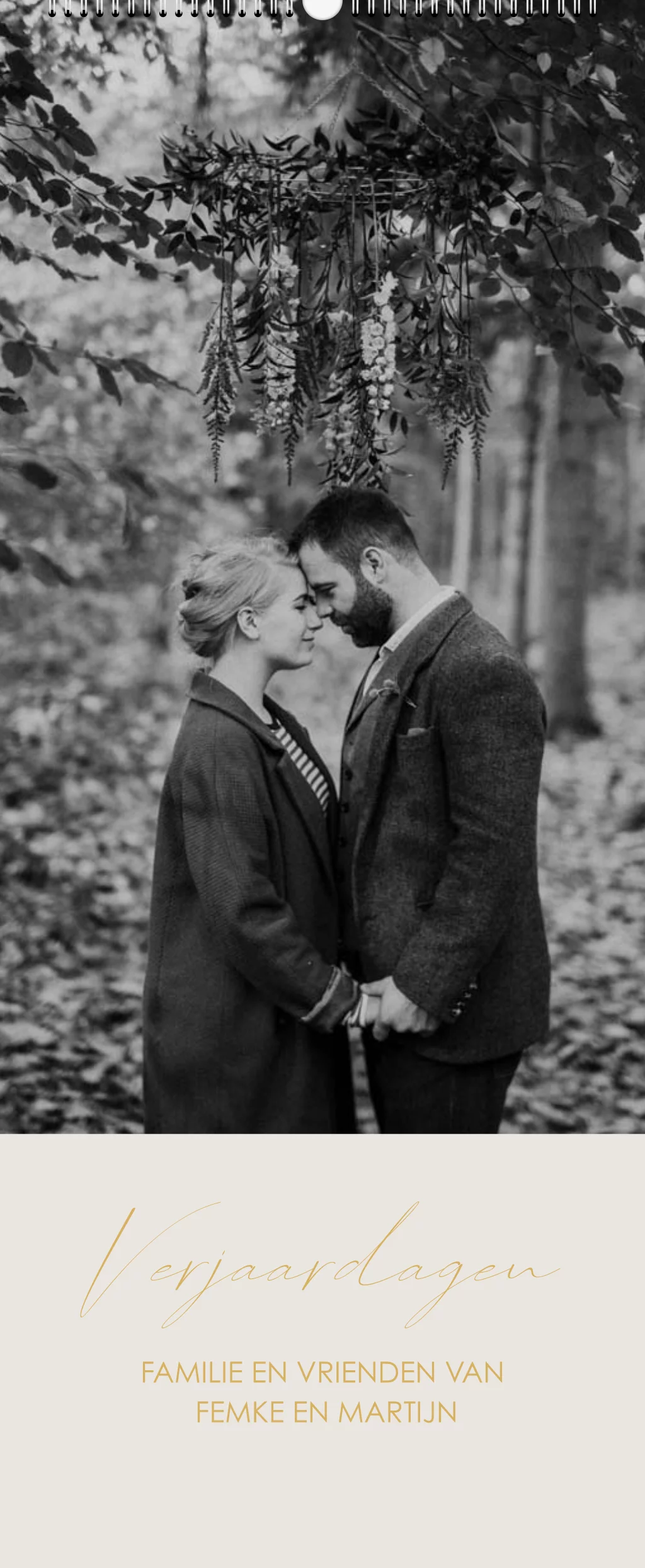 Gebruik een kalender als origineel alternatief voor een gastenboek. Laat bruiloftsgasten hun verjaardag noteren in deze kalender. Dit is een stijlvolle kalender in beige tinten en past bij een trouwkaart in dezelfde stijl.