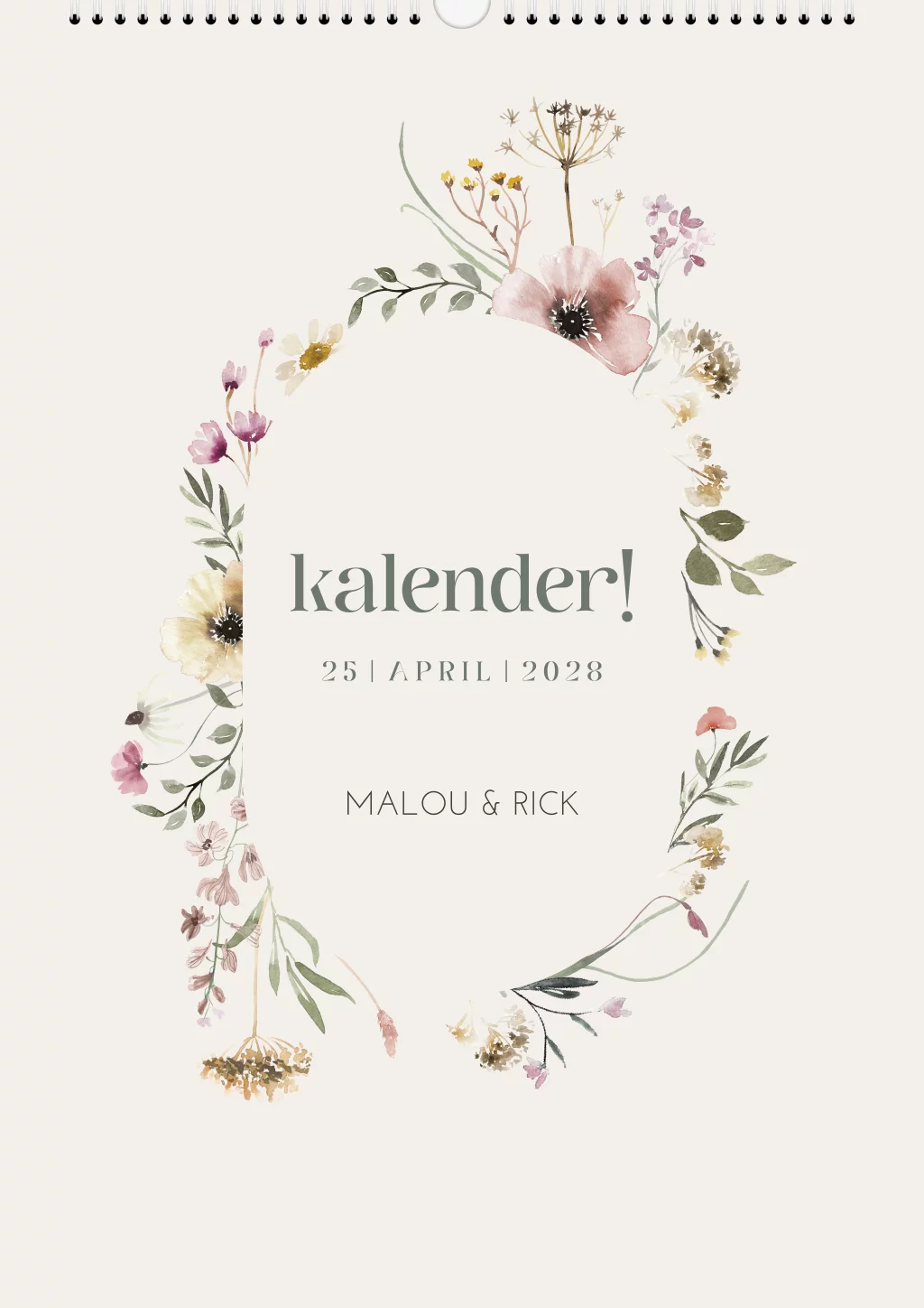 Ontwerp een kalender als gastenboek. Laat al de gasten hun verjaardag noteren in deze beige kalender met bloemetjes en hoogglans. Zo heb je een leuke herinnering aan de bruiloft.