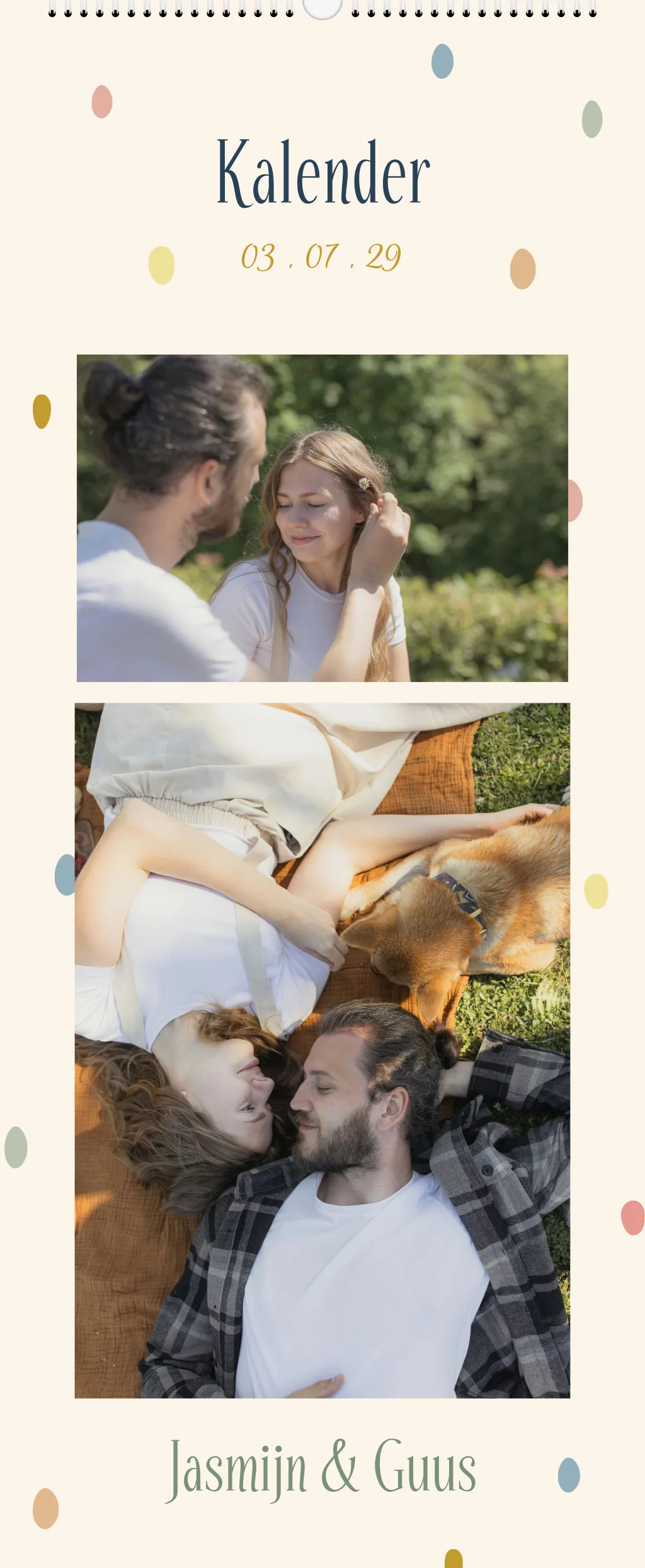 Maak een originele verjaardagskalender met kleurrijke stipjes. Een kalender is een leuk en persoonlijk alternatief voor een gastenboek. Upload bij elke maand persoonlijke foto's. Deze kalender past bij een trouwkaart in dezelfde stijl.