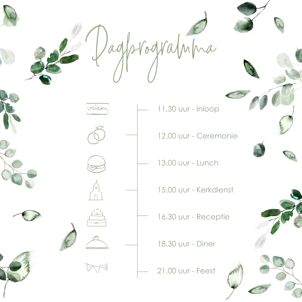 Ontwerp een extra kaartje bij de trouwkaart met het dagprogramma. Dit is een dagprogrammakaartje bruiloft van kalkpapier met eucalyptusblaadjes.| Totaalprijs: 0 |