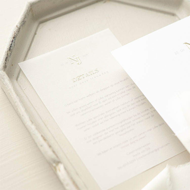 Bestel een extra kaartje voor bij de trouwkaart. Dit is een kaartje van kalkpapier met teksten in goudfolie. Op dit kaartje kun je extra informatie kwijt over de trouwdag, denk aan de dresscode, het programma van de dag, wie de ceremoniemeesters zijn of informatie over parkeergelegenheid.