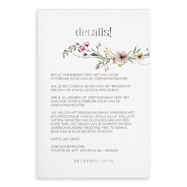 Ontwerp een extra kaartje bij je trouwkaart waar je alle informatie kwijt kan. Dit is een romantisch kaartje van kalkpapier met bloemetjes.| Totaalprijs: 0 |