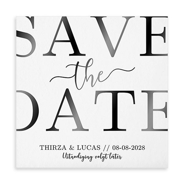 Maak een moderne Save the Date kaart van kalkpapier. Op deze Save the Date kaart wordt zwartfolie gedrukt. De kaart is doorzichtig, dus op de achterkant kan geen tekst staan.