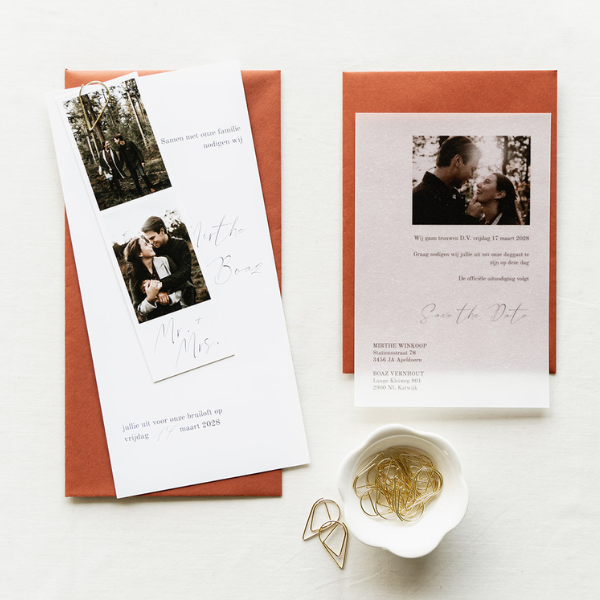 Een moderne Save the Date kaart met een foto op kalkpapier. Kies een mooie afbeelding van jullie voor op de Save the Date kaart. Kalkpapier is een licht doorschijnende papiersoort. Hierom kan geen informatie vermeld worden op de achterkant, want dit zou erdoorheen schijnen. Zorg er daarom voor dat alle informatie op één kant vermeld wordt.