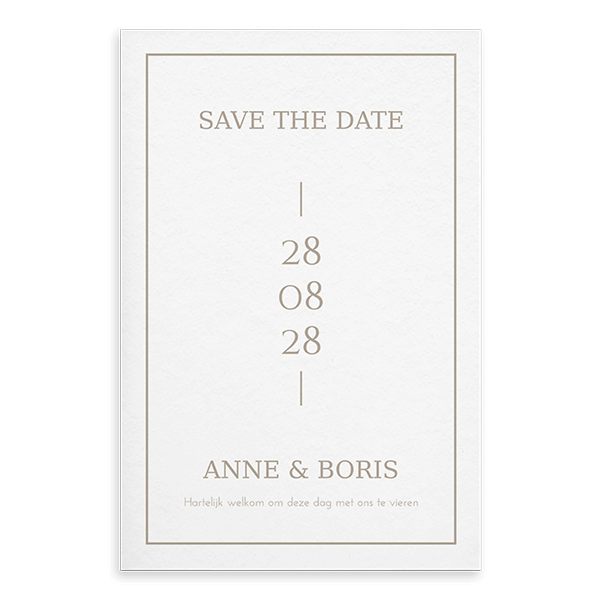 Ontwerp een moderne Save the Date kaart van kalkpapier. In de editor pas je eenvoudig de teksten aan. Het kalkpapier is doorzichtig, dus er kan niets op de achterkant gedrukt worden.