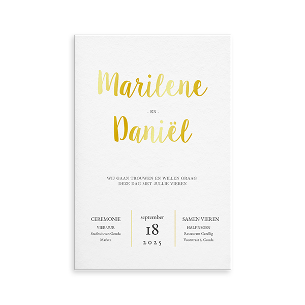 Een stijlvolle trouwuitnodiging die gedrukt wordt op kalkpapier en met een mooie glimmende laag folie. Je kunt bij deze trouwkaart een losse kaart achter plaatsen of zo versturen als alle informatie op de kaart staat.