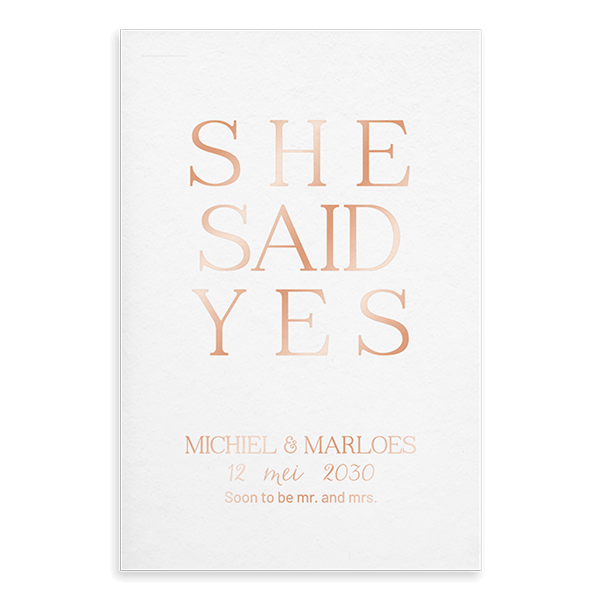 Ontwerp een moderne verlovingkaart kalkpapier met de teksten in roséfolie. Let op: een kalkpapier kaart is doorzichtig, dus het is niet mogelijk om informatie toe te voegen op de achterkant. Je kunt ook een andere kleur folie kiezen.