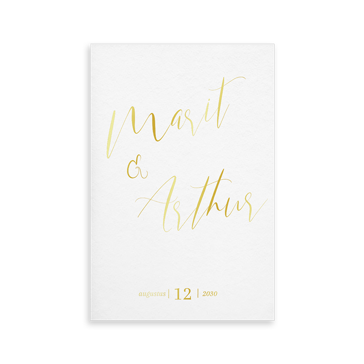 Ontwerp een kalkpapier voorblad voor een kalkpapier trouwkaart. Op deze kaart wordt goudfolie gedrukt. Omdat het materiaal doorschijnend is, kan alleen de voorkant bedrukt worden.