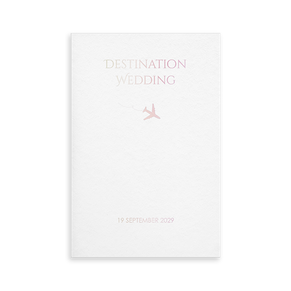 Ontwerp een originele trouwkaart voor een destination wedding. Dit is een trouwkaart van kalkpapier. De tekst wordt in holografische folie gedrukt, waardoor de tekst voelbaar is. Achter deze kaart hoort een extra trouwkaart, waar je alle informatie op kwijt kan.