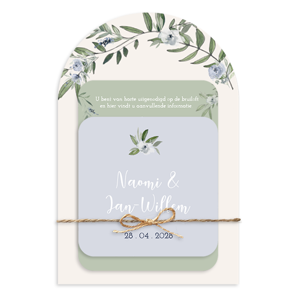 Een originele huwelijks met insteekkaartjes in blauwe en mintgroene kleuren. De grote kaart is 11 bij 17 cm. Het kleinere kaartje is 13 bij 9 cm en het kleinste kaartje is 9 bij 7,5 cm.| Totaalprijs: 0 |
