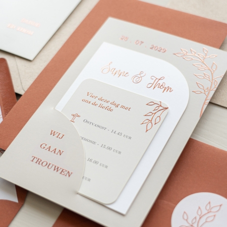Maak een originele trouwkaart met roséfolie en 2 insteekkaartjes.