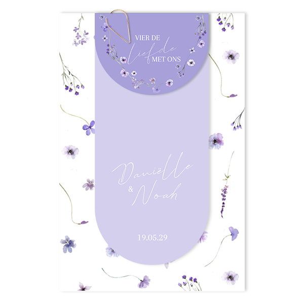Maak een trouwkaart met bloemen in paarse tinten. Deze trouwuitnodiging bestaat uit twee kaartjes. Het paarse kaartje maak je met een paperclip vast aan de hoofdkaart. Hierdoor zorg je voor een originele en persoonlijke kaart. De paperclips bestel je los bij de kaart, je vindt ze bij producten.