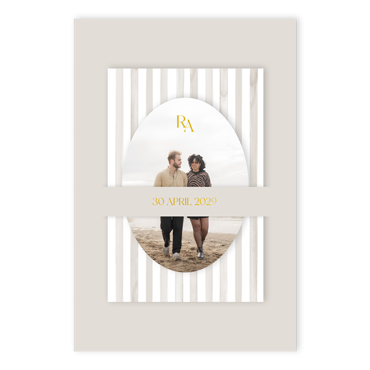 Ontwerp een beige trouwkaart met twee losse kaartjes die je steekt in de hoofdkaart. Op de hoofdkaart kan je het programma van de trouwdag en een illustratie van jullie trouwlocatie toevoegen. Op de kleinere kaartjes is ruimte voor extra informatie, zoals de dresscode en locaties. Upload op het ovale kaartje de mooiste foto van jullie samen. Sommige teksten worden in goudfolie gedrukt, wat zorgt voor een chique look.