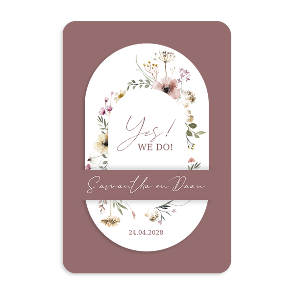Ontwerp een originele trouwkaart in roze met bloemen. Deze trouwuitnodiging bestaat uit twee kaartjes. De achterste kaart heeft een roze kleur met op de achterkant infomatie. Het voorste kaartje heeft illustratie van een krans van bloemen. Dit ovale kaartje schuif je in de achterste kaart.
