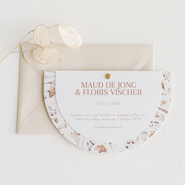 Maak een originele trouwkaart met illustraties van naturel bloemen. Deze trouwuitnodiging bestaat uit twee kaartjes in halve boog vorm.| Totaalprijs: 0 |