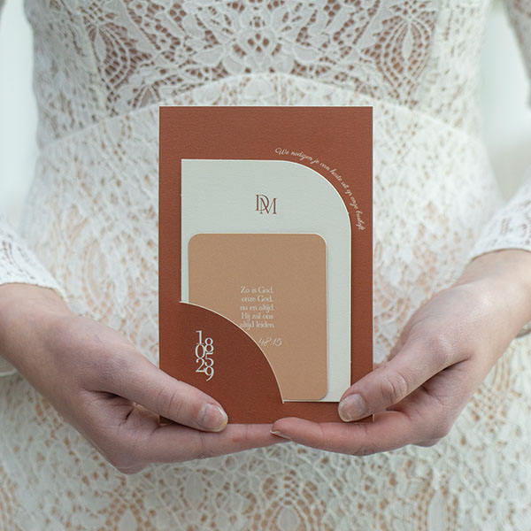Ontwerp een originele trouwkaart in bruinrode tinten en meerdere kaartjes. Deze twee kleinere kaartjes steek je in de hoofdkaart. Op deze moderne trouwkaart staat een logo van jullie initialen. Voeg zelf een mooie quote of Bijbeltekst toe op het kleinste kaartje.