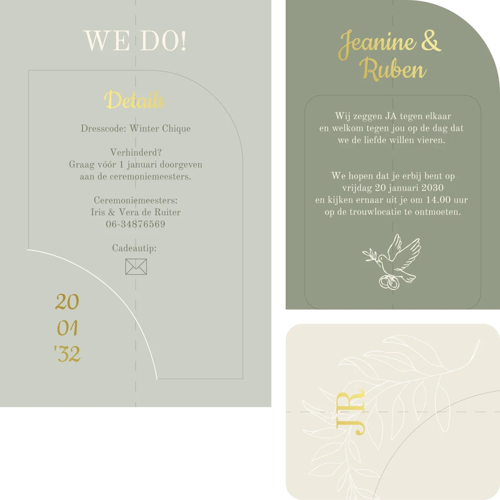 Maak een originele trouwkaart om te versturen naar familie en vrienden. Dit is een trouwkaart met meerdere kaartjes in groene tinten. De twee kleinere kaartjes schuif je in de hoofdkaart. Op de achterkant van het kleinste kaartje upload je in de editor eenvoudig jullie mooiste foto. Op deze groene trouwkaart wordt goudfolie gedrukt, wat zorgt voor een glimmend laagje op de trouwkaart.