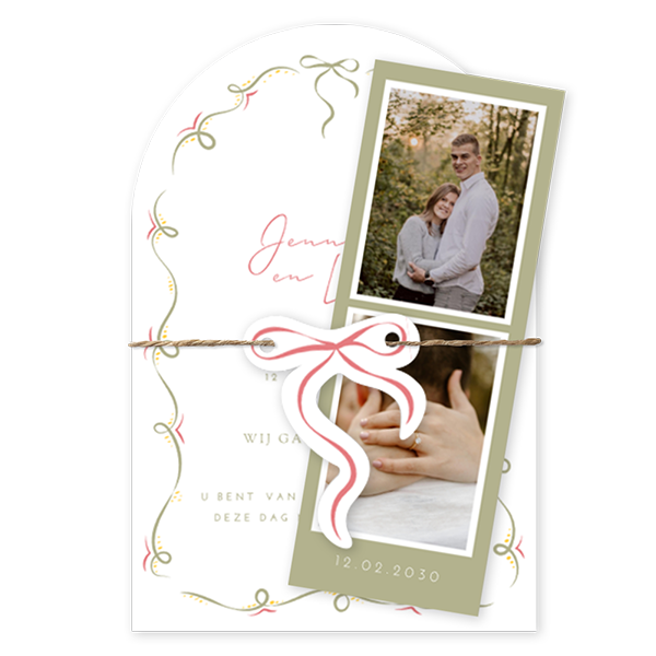 Bestel een romantische trouwkaart met meerdere kaartjes. Dit is een trouwkaart in boogvorm met een fotostrookje en een roze strik. Je bindt touwtje om de trouwkaart en maak daarmee het strikje vast, hier zitten namelijk 2 gaatjes in. Bekijk hier onze touwtjes.