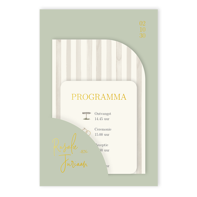 Ontwerp een trouwkaart met meerdere kaartjes in groene tinten. Deze kaartjes steek je in de hoofdkaart. Op de achterkant upload je eenvoudig jullie mooiste foto. Dankzij de meerdere kaartjes is er genoeg ruimte voor alle informatie over jullie trouwdag.
