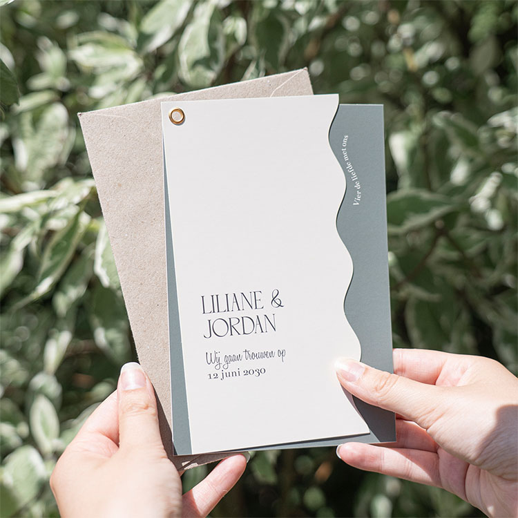 Ontwerp een trend trouwkaart in groene tinten met twee kaartjes. Het bovenste kaartje met boogjes maak je door middel van een flenstang vast aan de groene kaart.