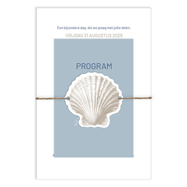 Een unieke uitnodiging met een strand vibe door de mooi schelp. Je ontvangt 3 kaarten waarvan de schelp 2 gaatje heeft. Door touw er bij te bestellen kun je deze om de trouwkaart binden. Dan ook nog een klein kaartje erbij...en je hebt echt iets unieks. De trouwkaart is 11 bij 17 cm.| Totaalprijs: 0 |