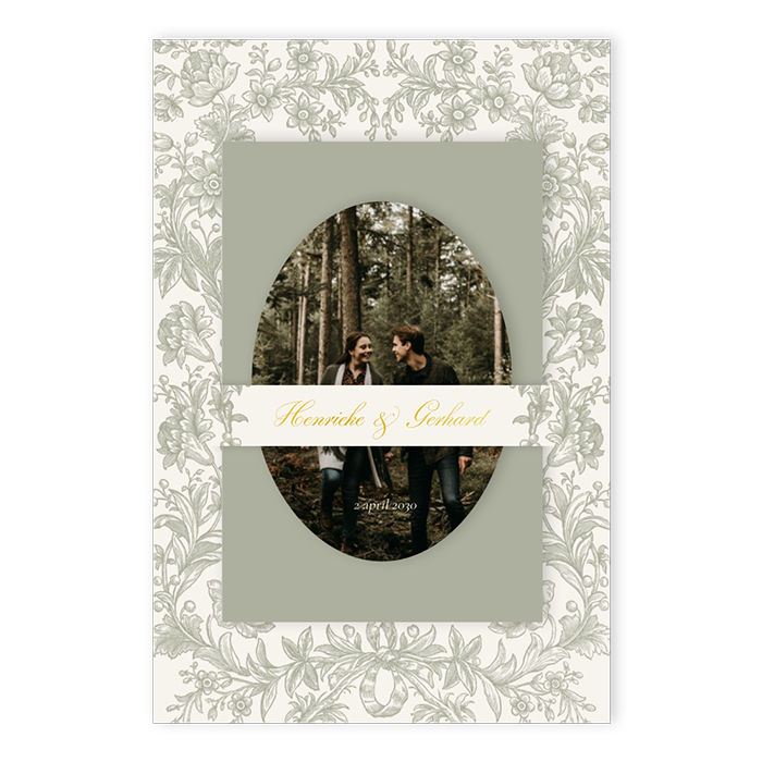Maak jullie trouwdatum bekend met een vintage trouwkaart die je stuurt naar familie en vrienden. Dit is een trouwkaart met meerdere kaartjes in groene tinten. De twee kleinere kaartjes schuif je achter het strookje in de hoofdkaart. Op het kleinste kaartje upload je eenvoudig een mooie foto. Op deze kaart wordt goudfolie gedrukt.