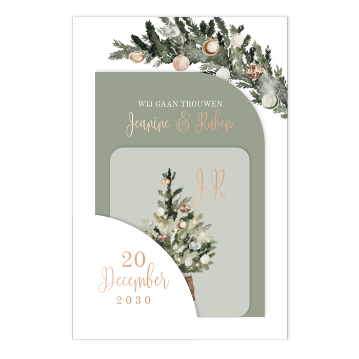 Trouw jij in de winter? Ontwerp dan een winter trouwkaart voor jullie trouwdag. Dit is een trouwkaart met meerdere kaartjes in groene tinten. Sommige teksten worden in roséfolie gedrukt, dit zorgt voor een extra glimmend laagje op de kaart. De twee kleinere kaartjes schuif je in de witte hoofdkaart.